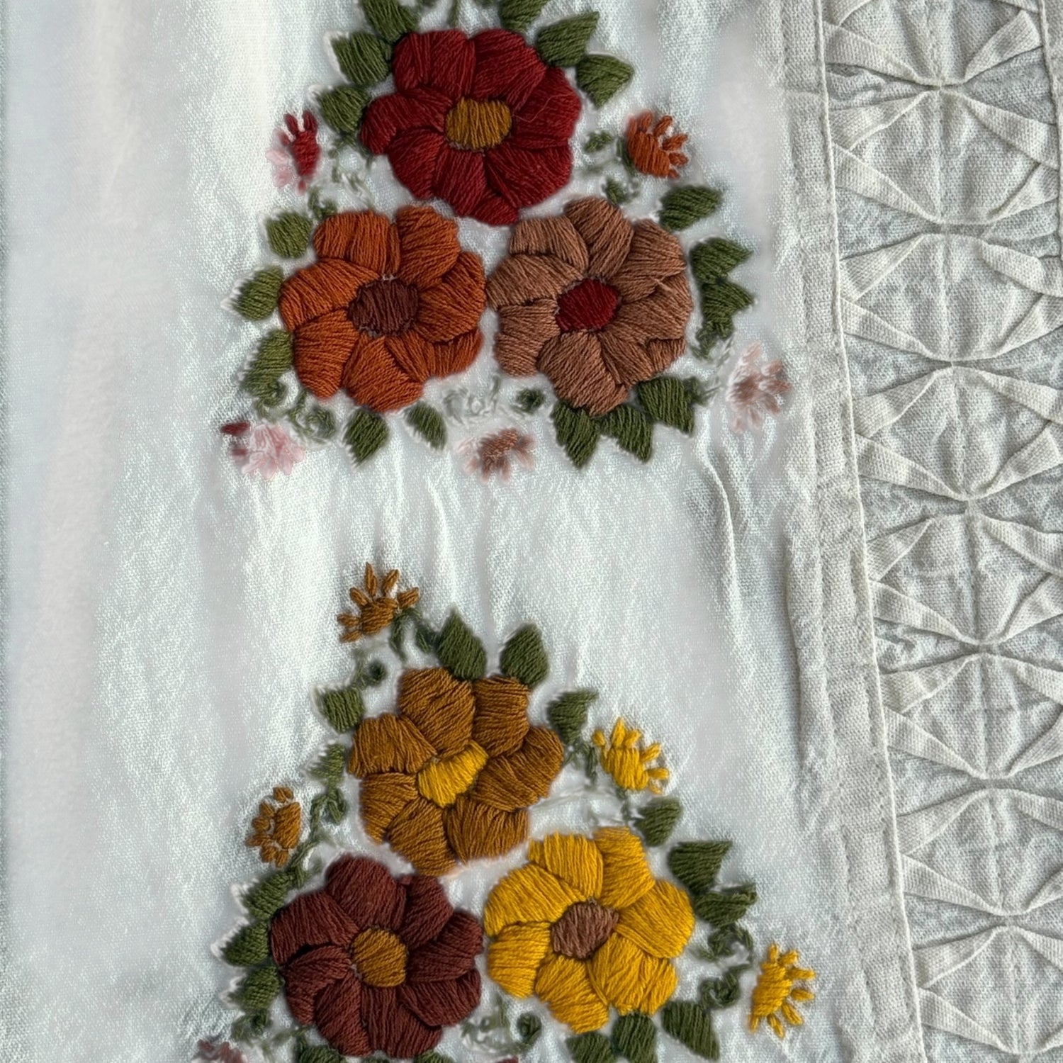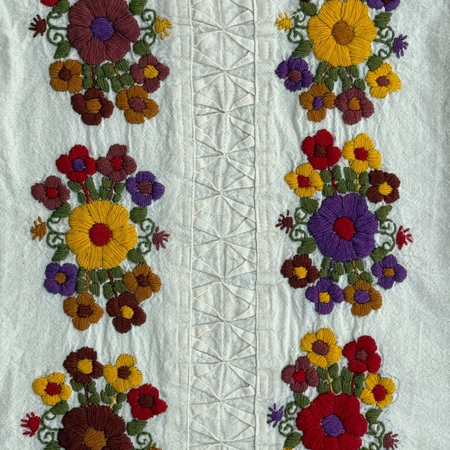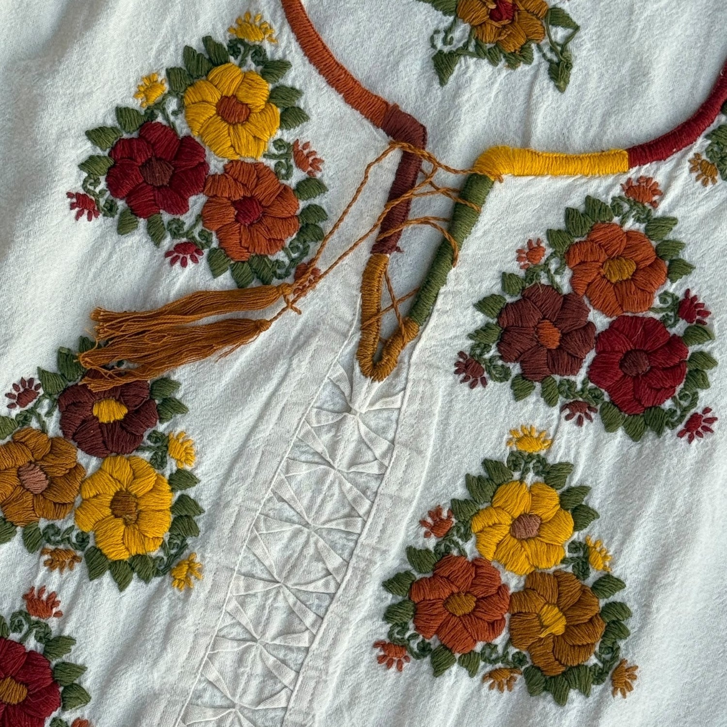 Cada pieza es única e irrepetible. Si bien las piezas no se repiten llevan el patrón de colores, una opción son el bordado con colores tierra y otra opción el bordado es con colores vivos.