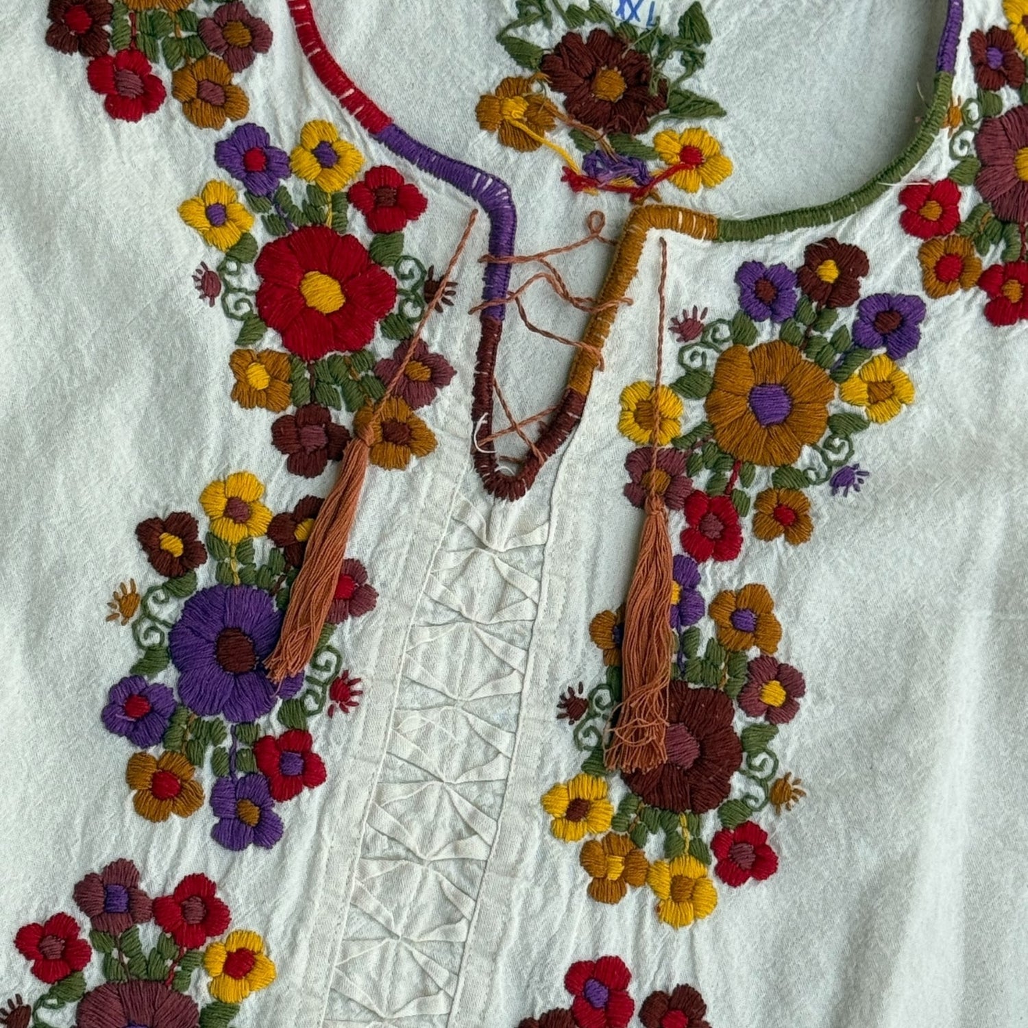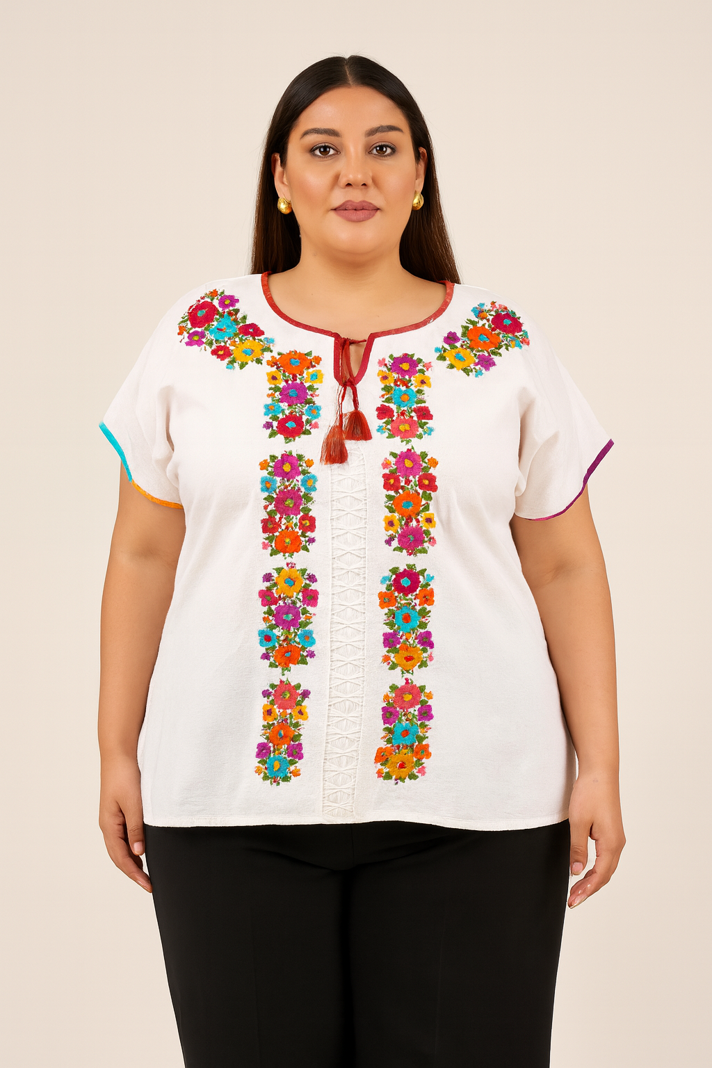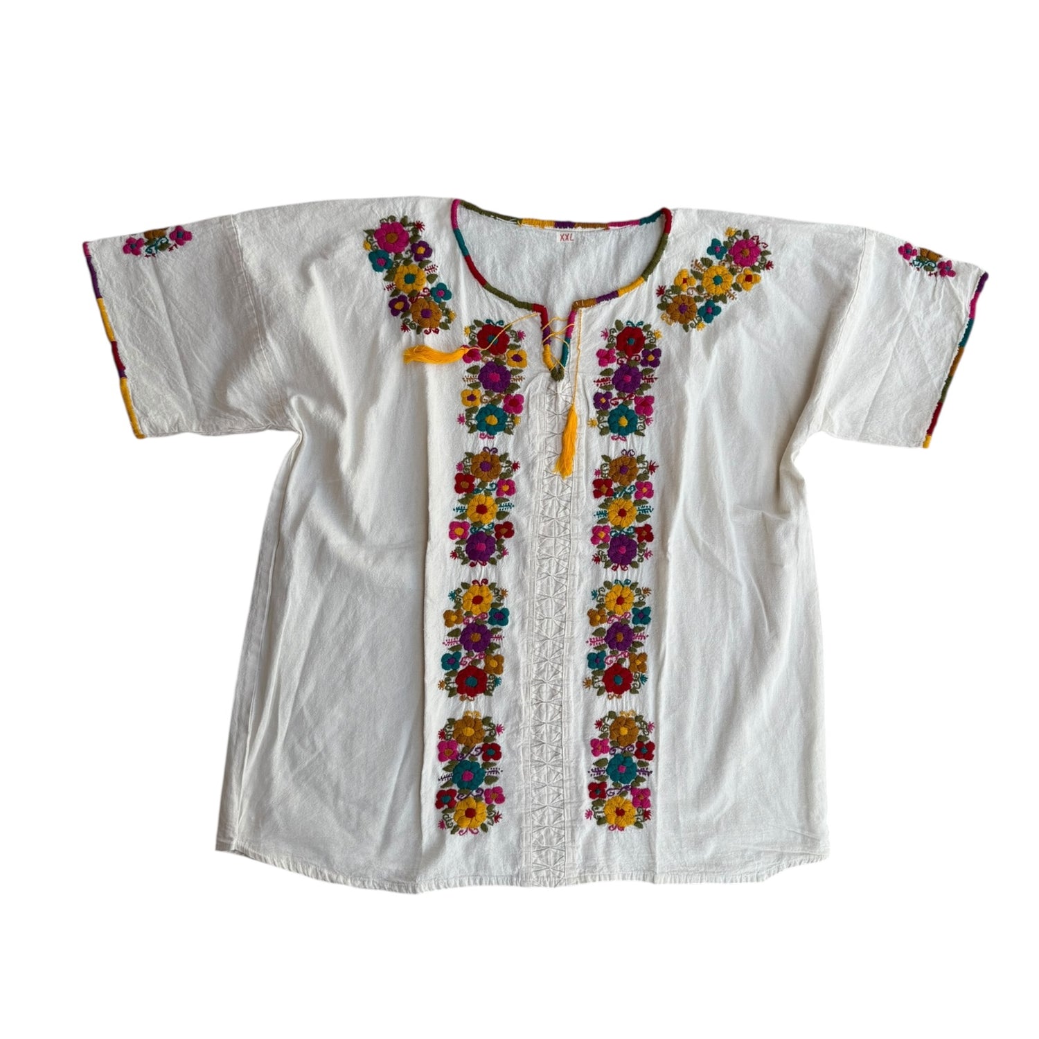 Hermosa blusa bordada a mano sobre tela de manta 100% de algodón. Piezas en talla XXL. Bordada por artesanas de los altos de Chiapas.