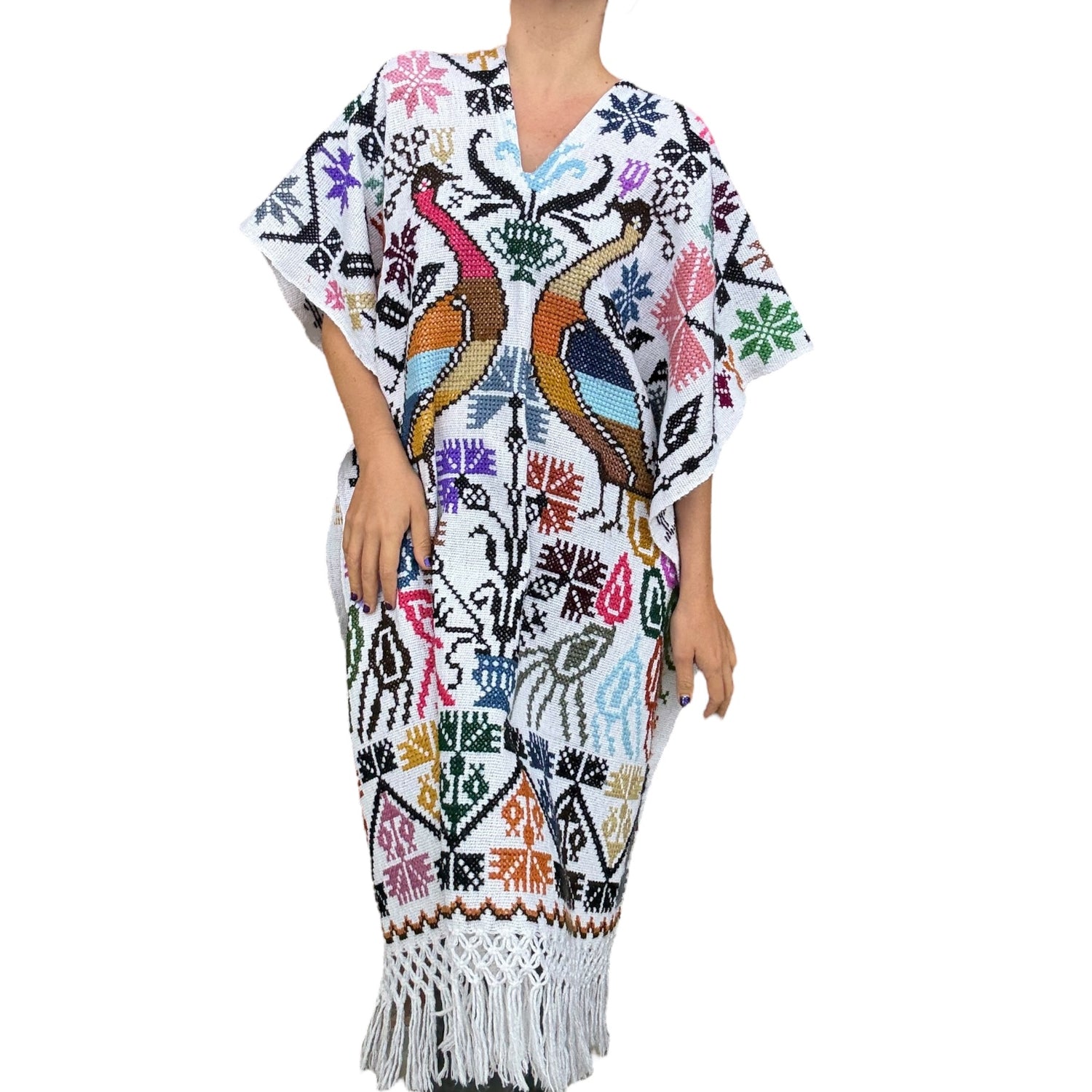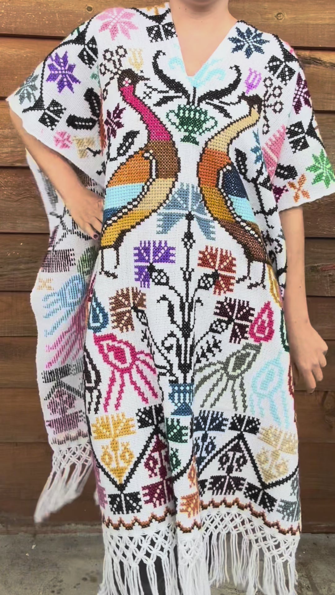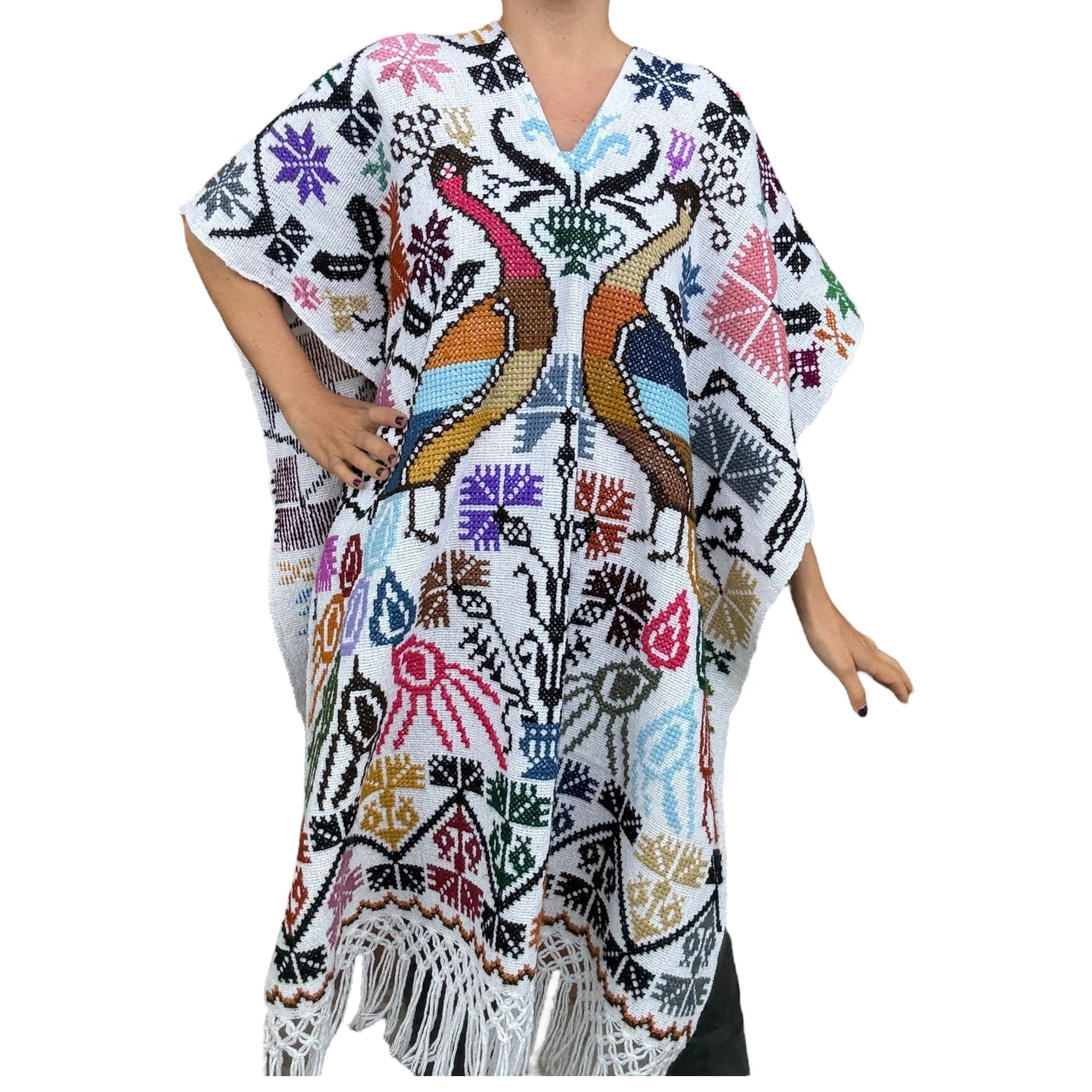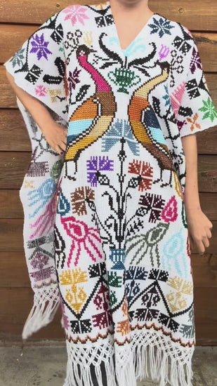 Gabán Jorongo Poncho Hueyapan Producto hecho y bordado 100% a mano con técnica punto de cruz con hilo de estambre. Está adornado en los extremos inferiores con orlas/flequillos. Producto artesanal pieza única. Pieza bordada por Magda de Hueyapan.