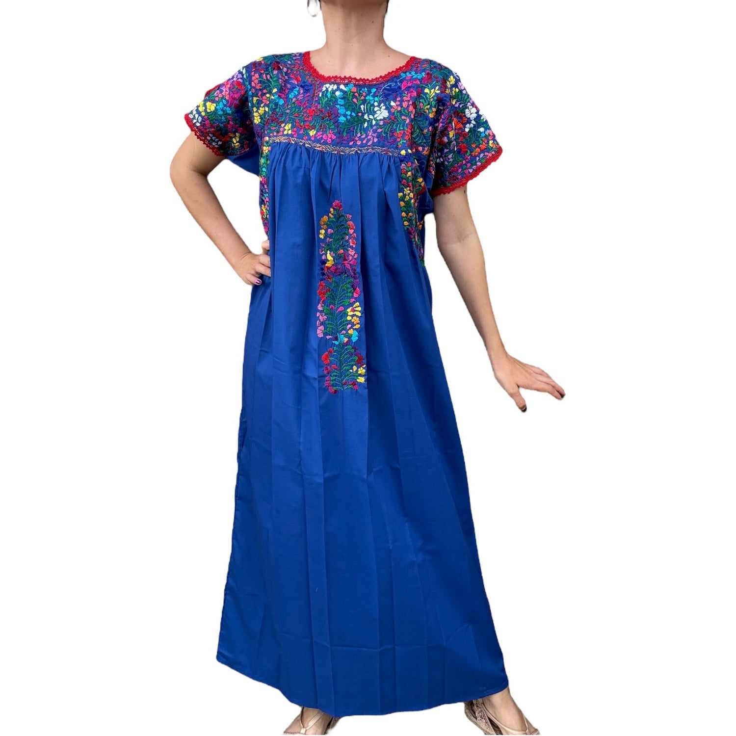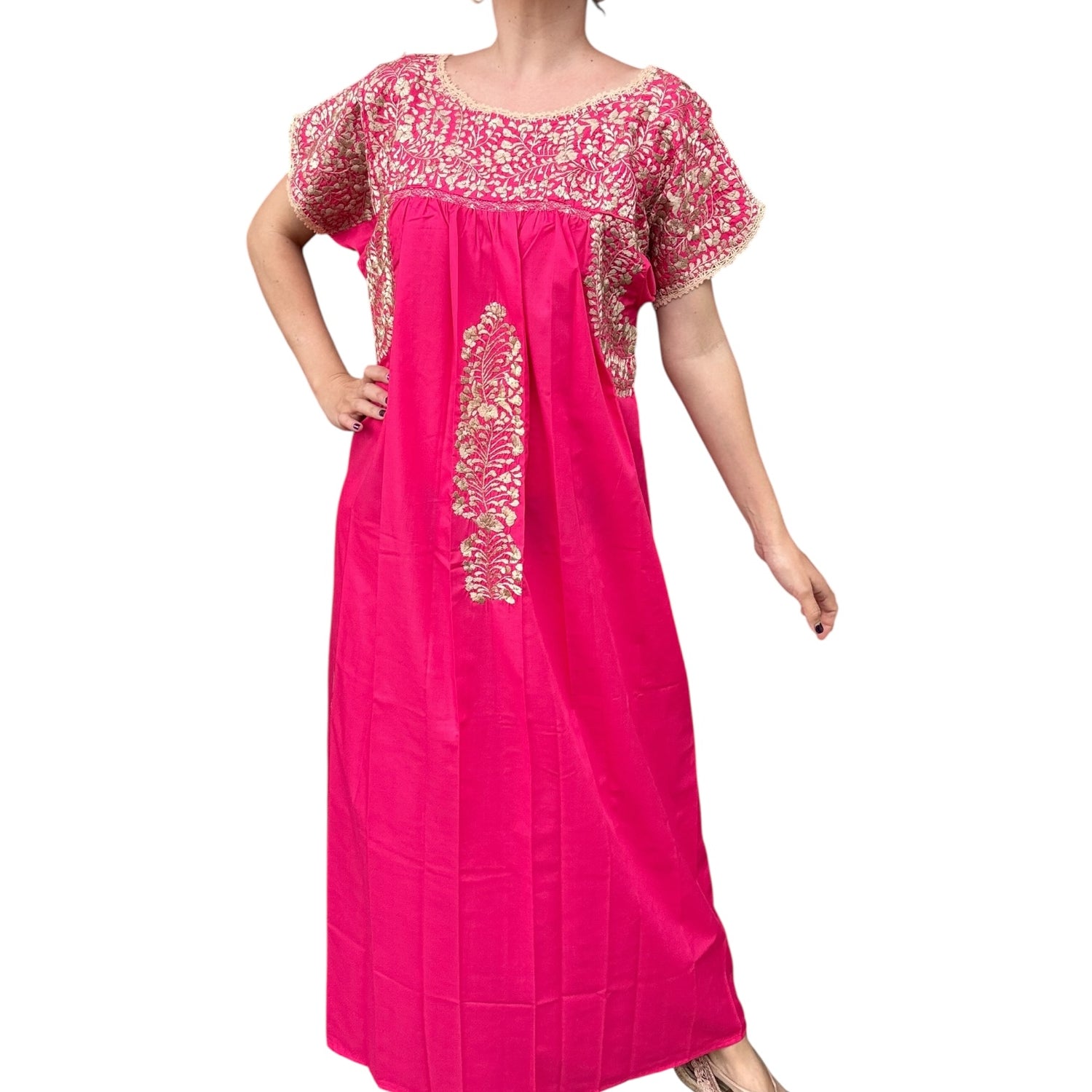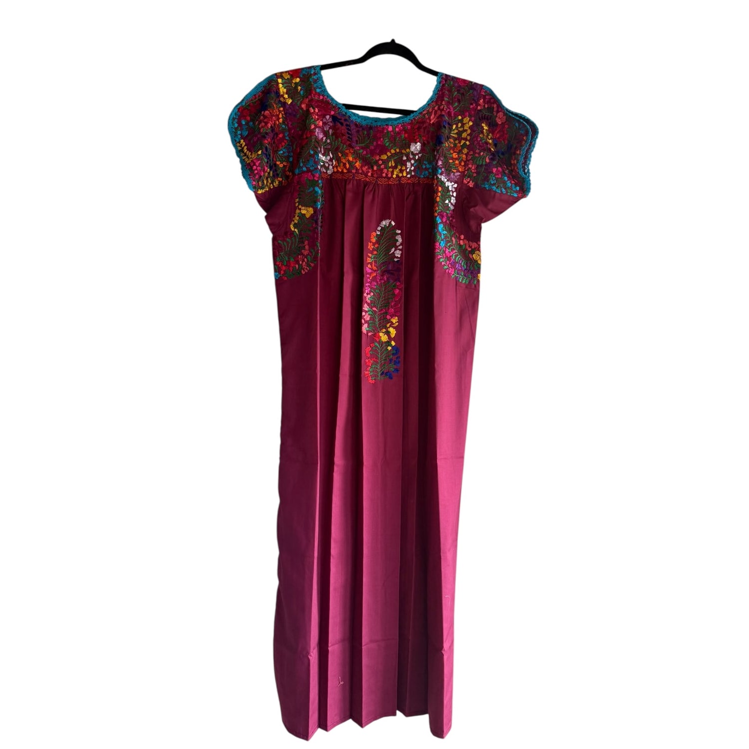 Vestido Huipil Mexicano con bordado típico. Hecho y bordado a mano por nuestras artesanas Mexicanas sobre tela popelina con hilo de seda. Trabajo de diseño artesanal que, aunque siguen el mismo patrón de bordado, los colores pueden variar de pieza a pieza.