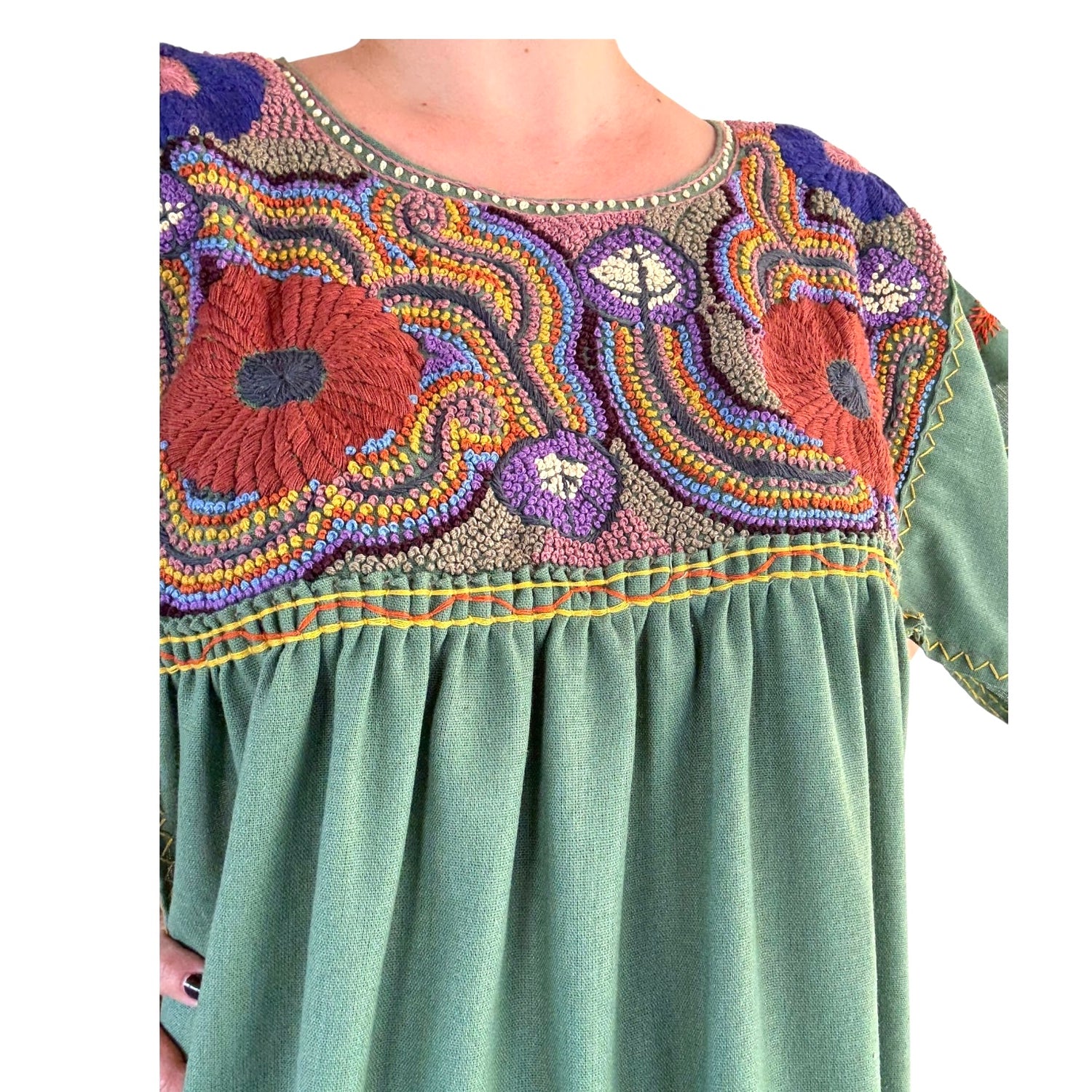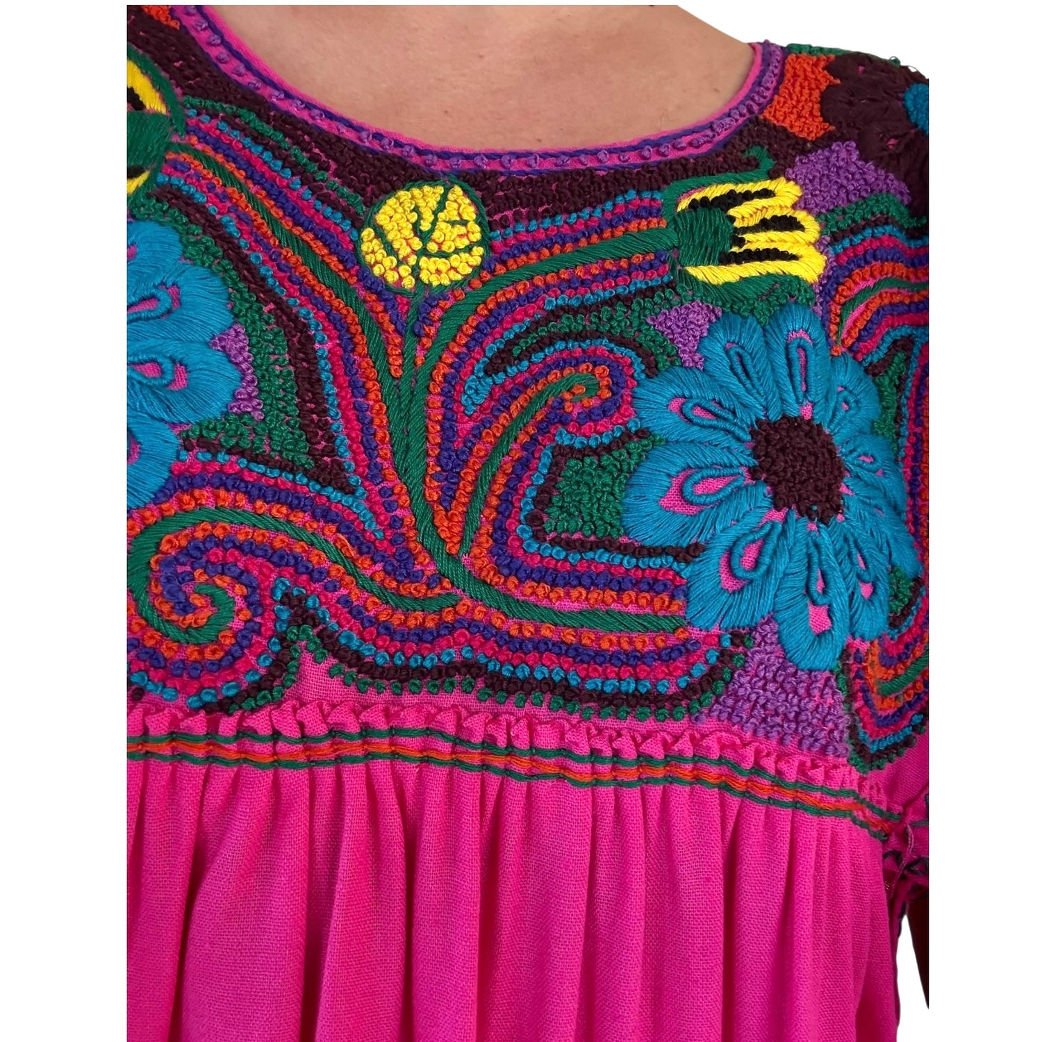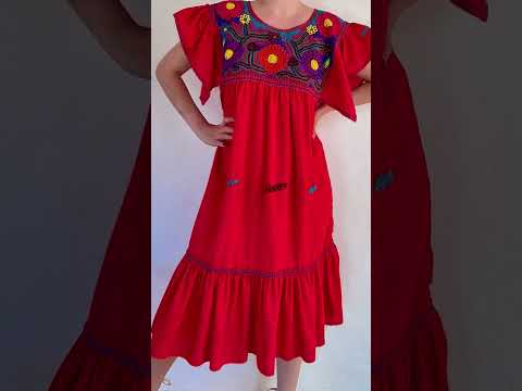 Vestido Mexicano con bordado típico. Hecho y bordado a mano por nuestras artesanas Mexicanas sobre tela de lino en múltiples colores. Trabajo de diseño artesanal piezas únicas. Tiene manga mariposa y está bordado por el frente.