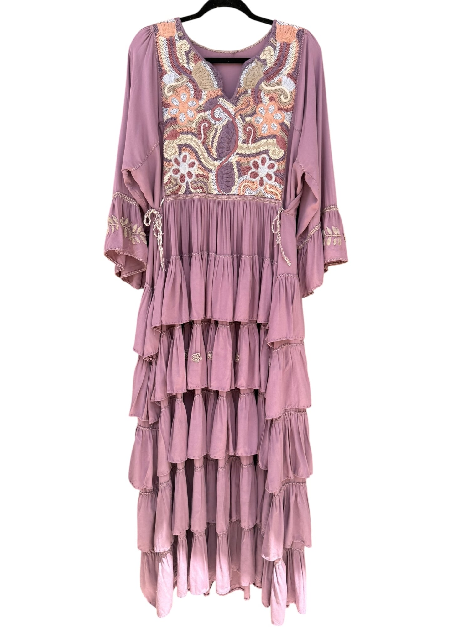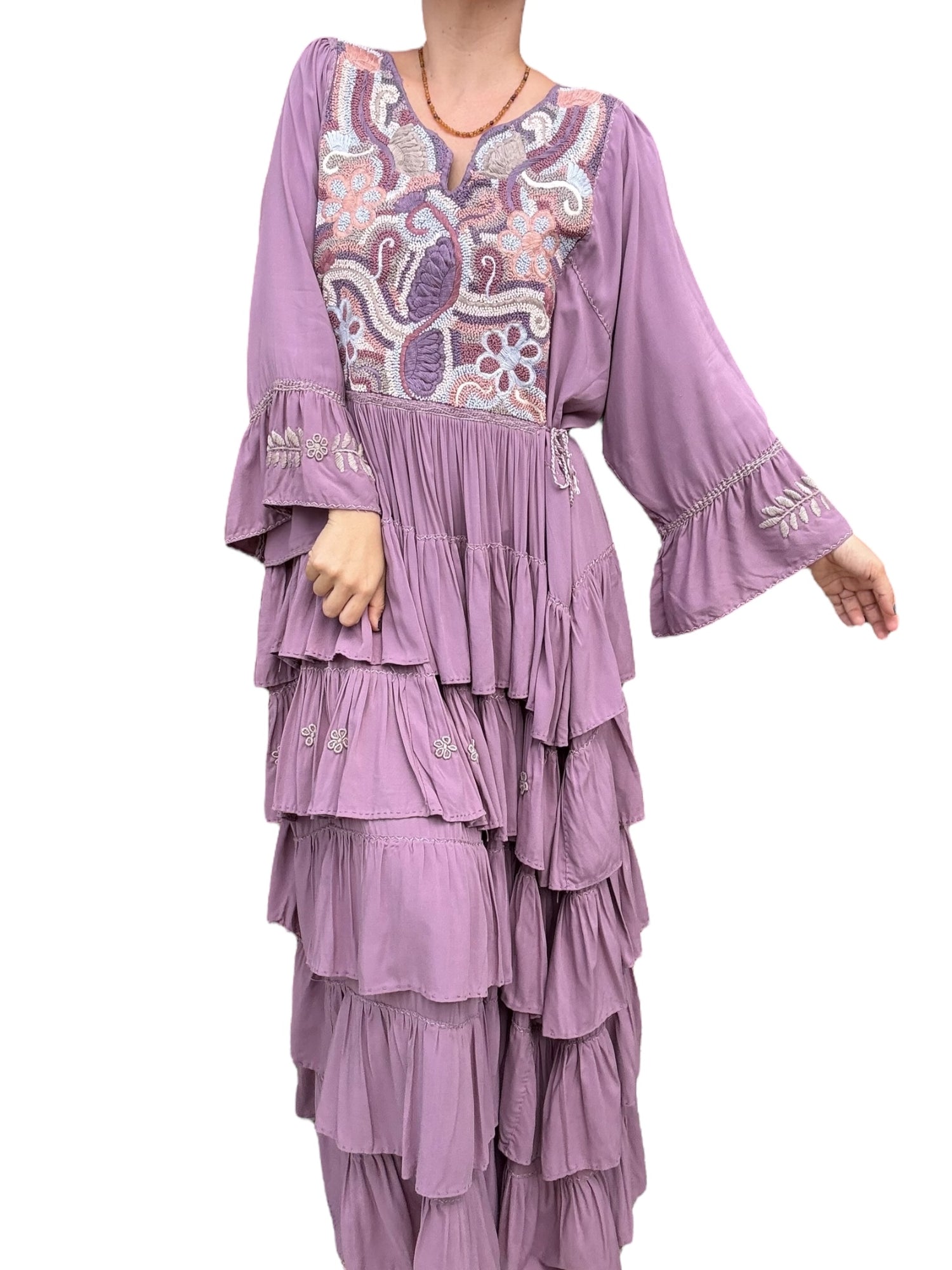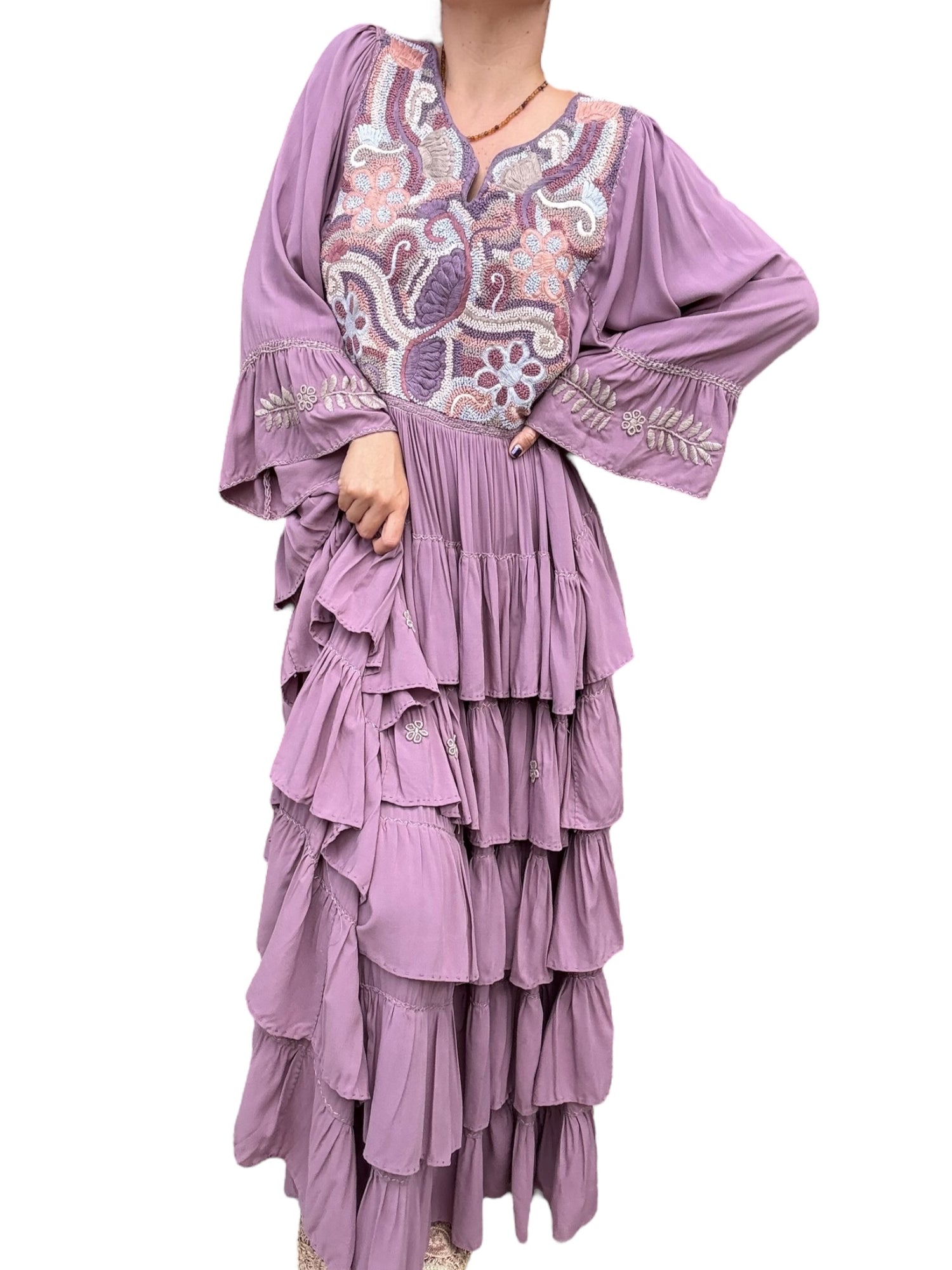 Vestido Mexicano con bordado típico. Hecho y bordado a mano por nuestras artesanas Mexicanas sobre tela de Rayón en múltiples colores. Trabajo de diseño artesanal pieza única. tiene manga 3/4 campana y está bordado por el frente.